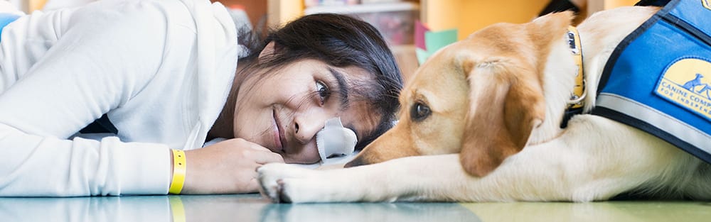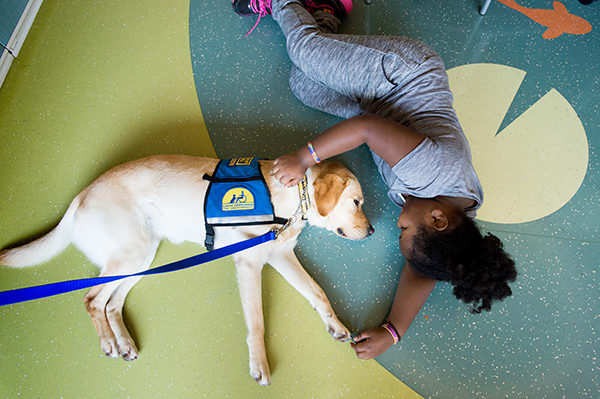 Combining the expertise of a child life specialist with a highly trained facility dog creates magic for our young patients. “Kimono [Momo] can have a huge impact on a patient’s recovery,” says Eileen “She encourages difficult physical therapy, making it fun and providing a little extra comfort just when it’s needed most. For many of my patients, seeing Kimono is the bright spot in their day of treatment.”